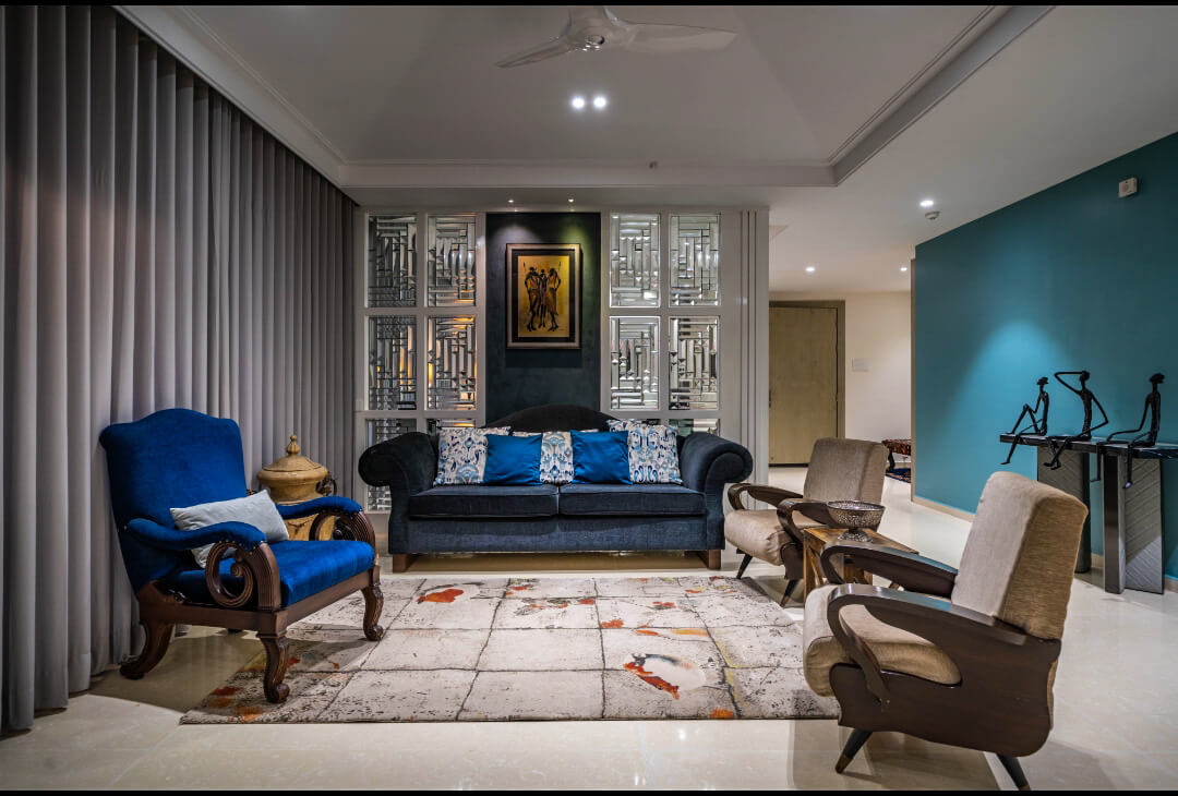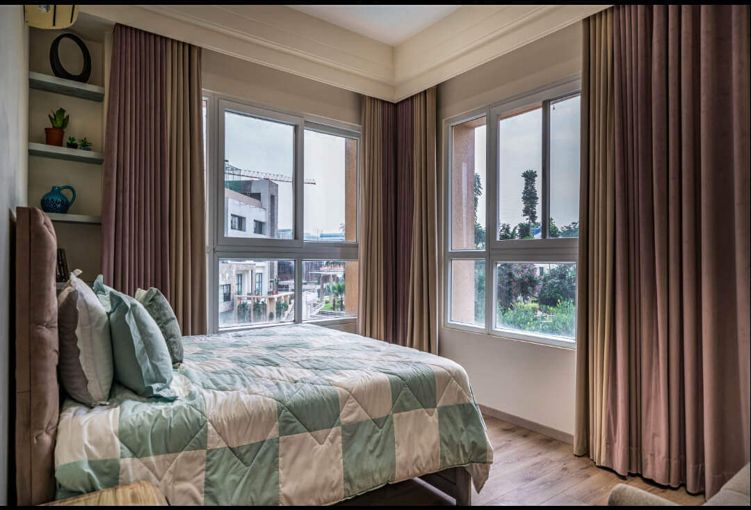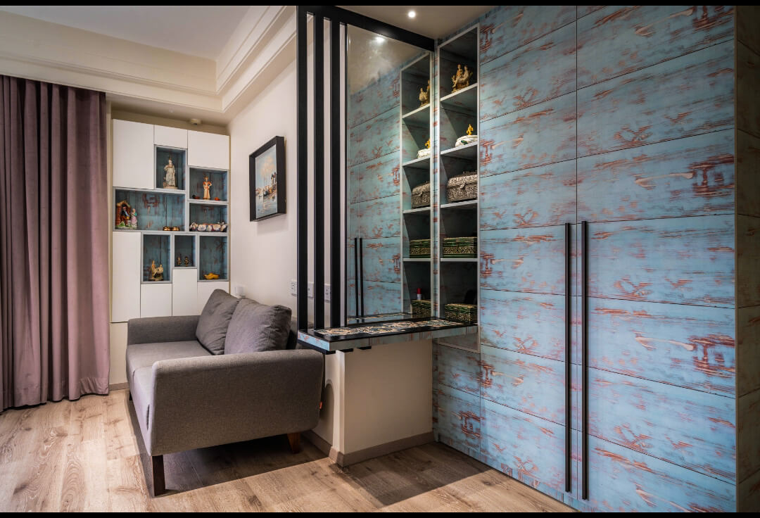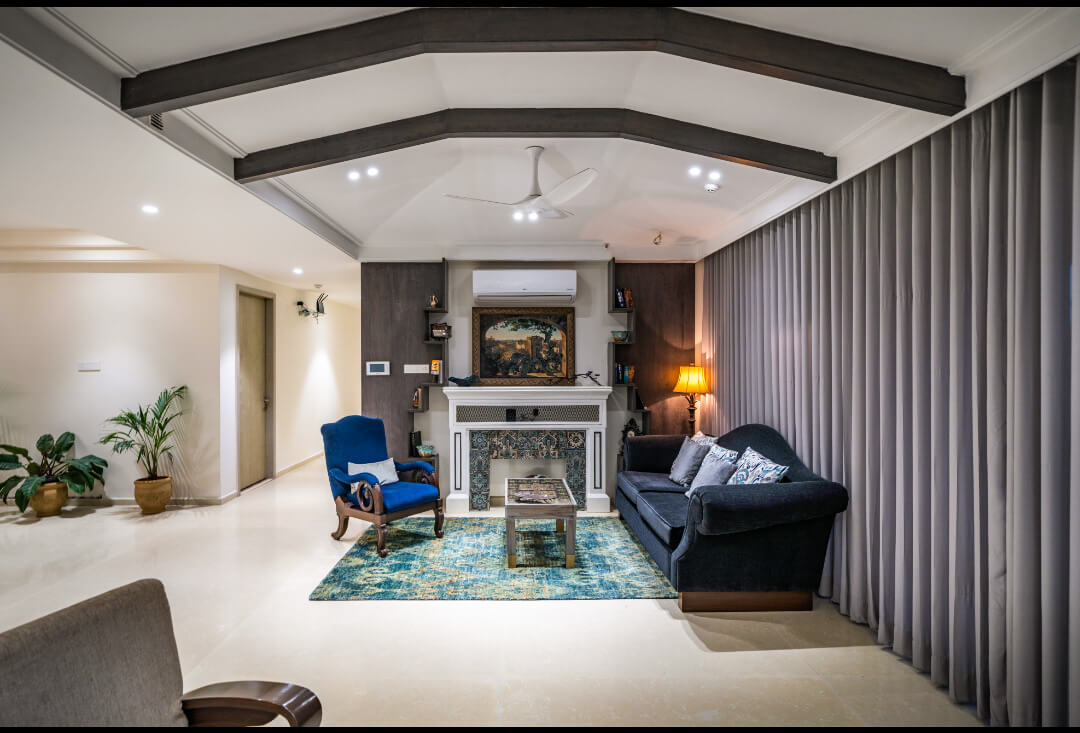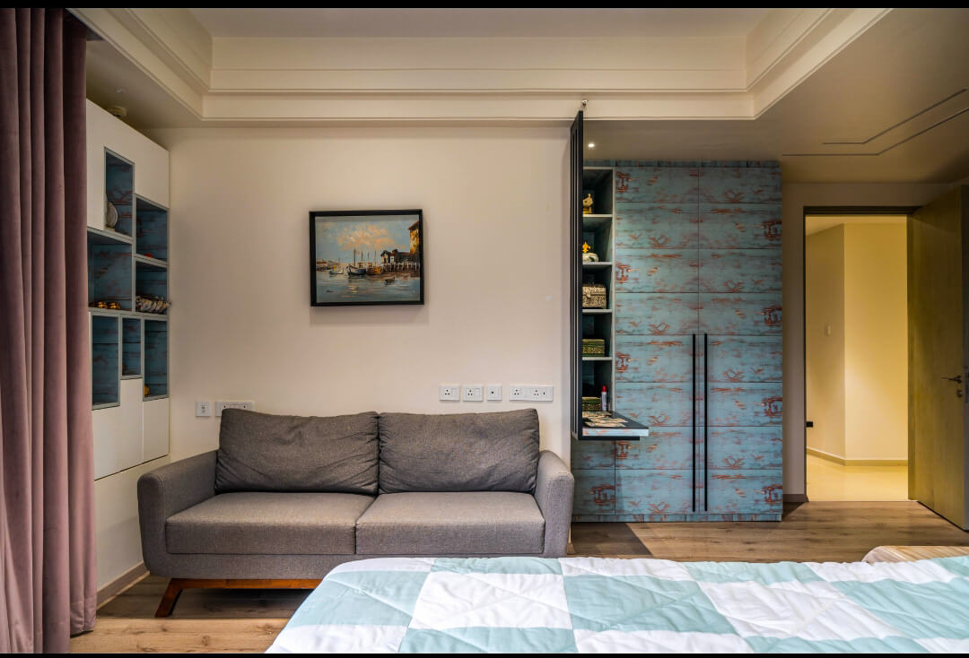The master bed perfectly captured the outdoors to indoors connect, while one of the other rooms was given a customized vintage industrial barn door, for a dramatic entrance. The grey curtains in the dining area symbolized a revival of retro style with an eclectic blend, and wholly beige color walls complemented with vintage blue upholstery, the whites brought in a much needed openness to the spaces. We made sure that we played with texture and symmetry all around to create this slice of perfection.