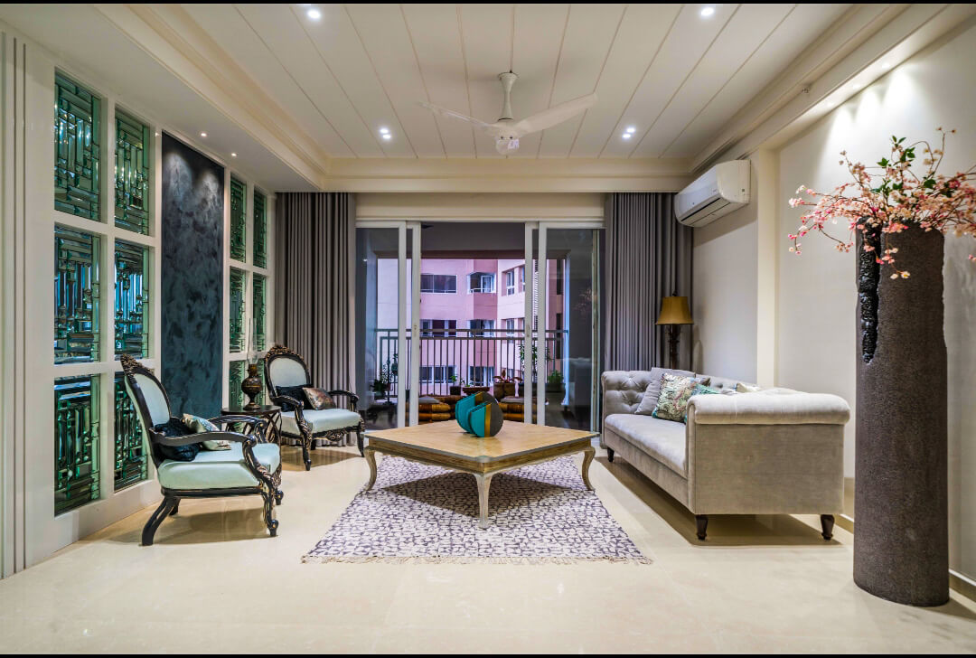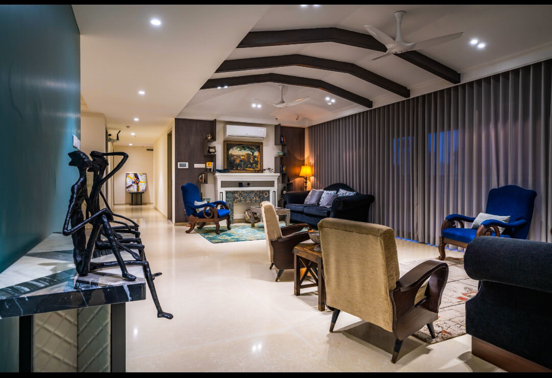 The furniture in the formal living area brings in the illusion of broader spaces, and the asymmetrically placed coffee table makes sure the room looks expansive. The ceiling is enhanced with the multi-grooving design, further accentuated in muted white.