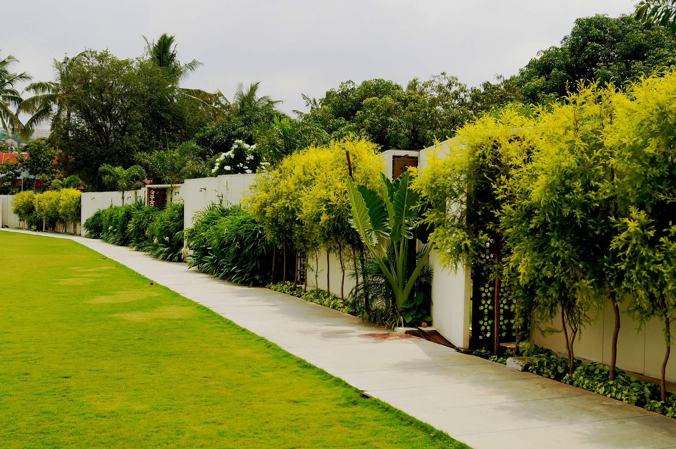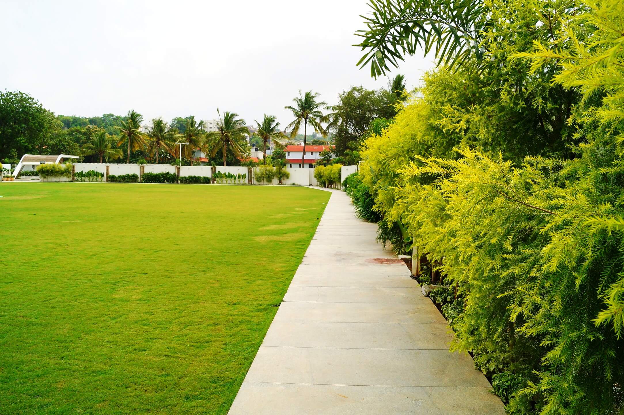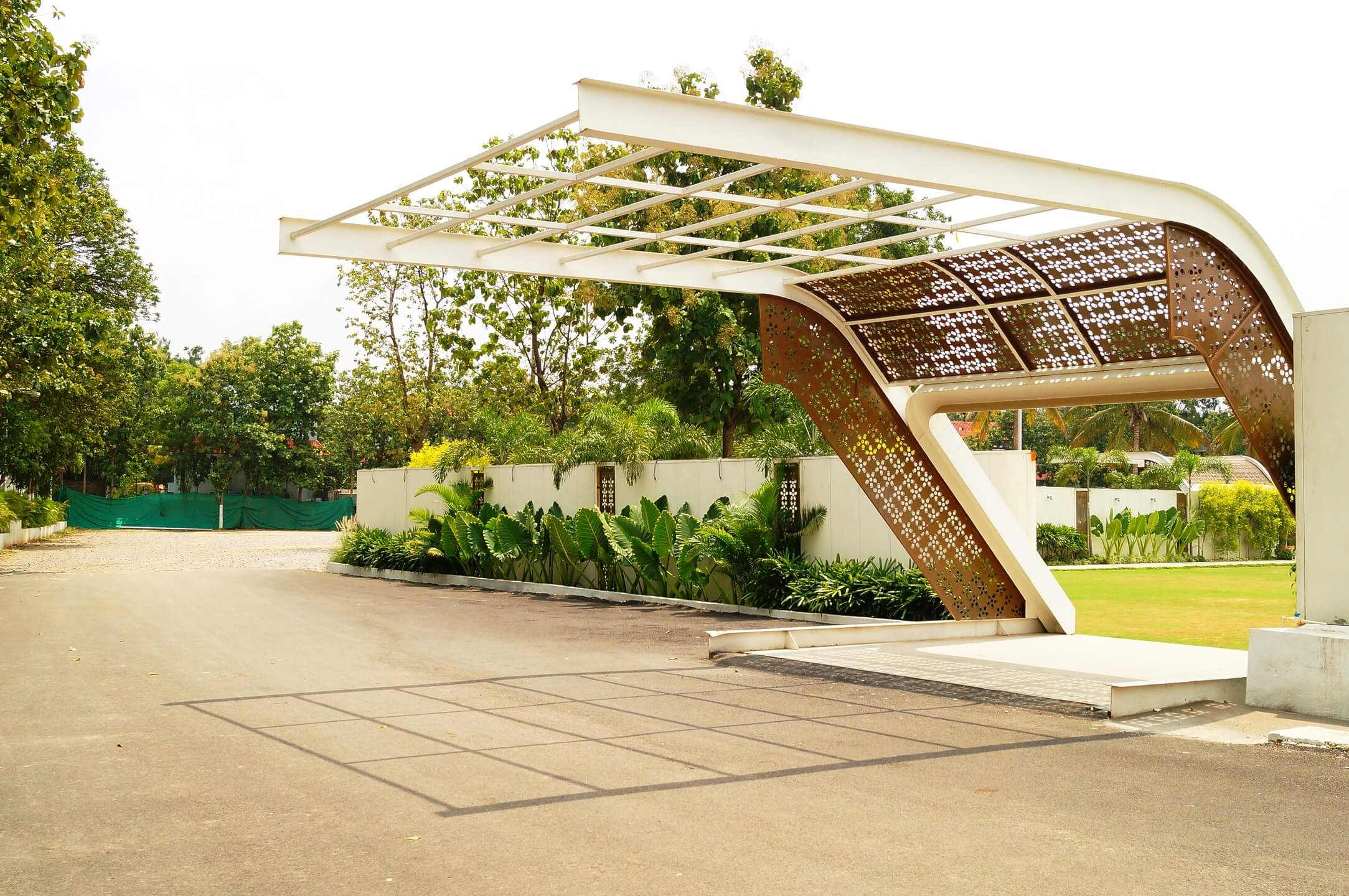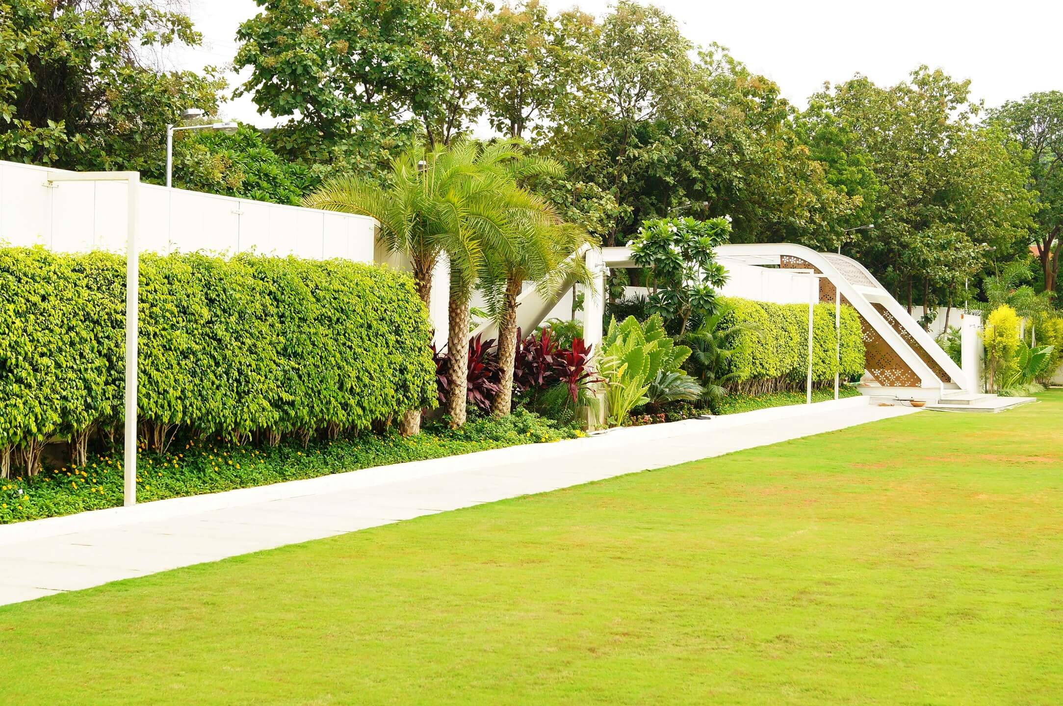 A haven for your events, intimate gatherings and moments of celebration, JRC was designed with white being the star of the colour palette to maintain an open demeanour for people to be able to use the space with the freedom to create an experience of their choosing, without being constrained by the striking nature of the colours we used. We wanted to create openness and an inviting feeling in the whole space, and the design thinking does exactly that. Upon entering the lawn, the area has been intentionally fragmented across the boundary with the help of screens. We played with abstract geometry to merge this approach with the integrity of the elevation.