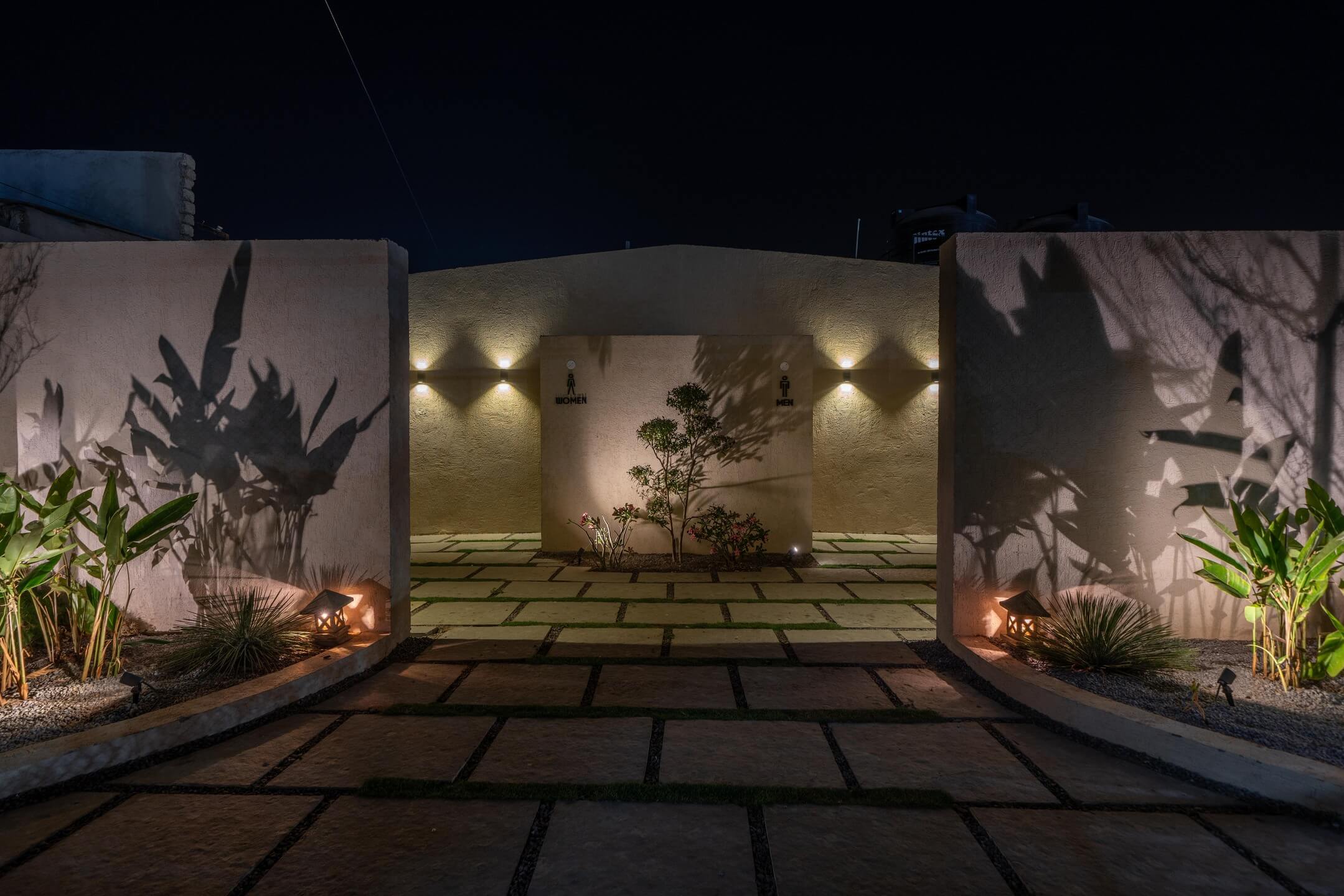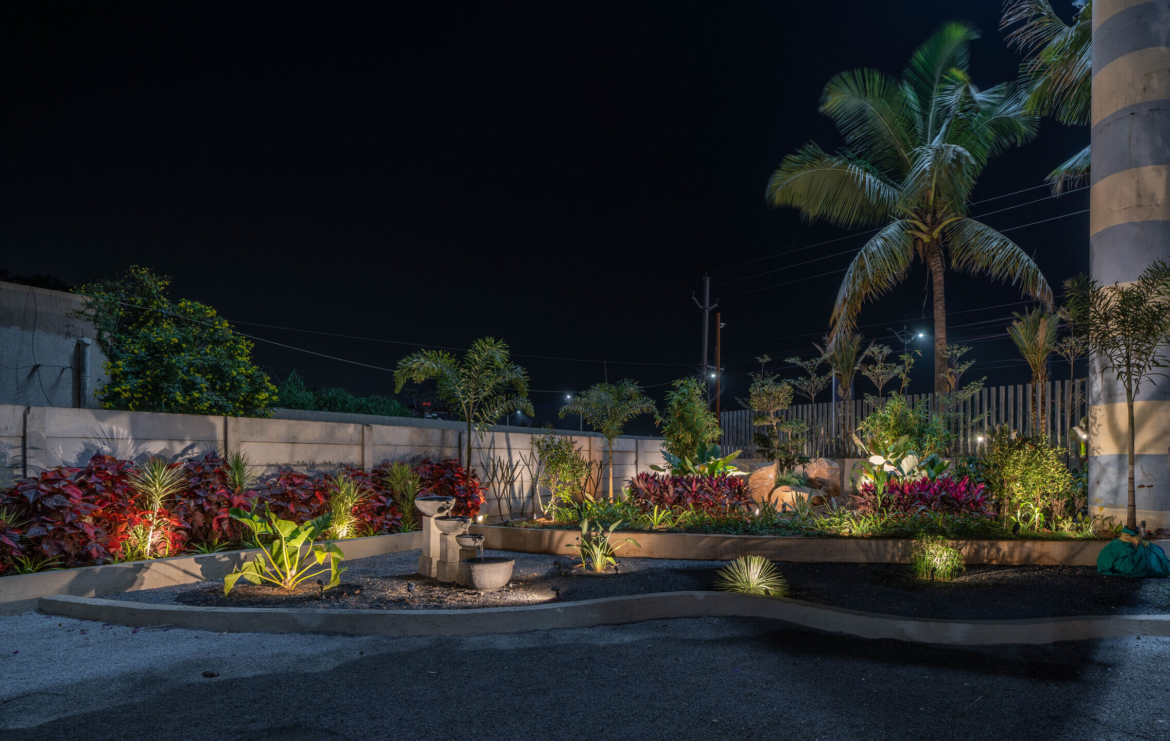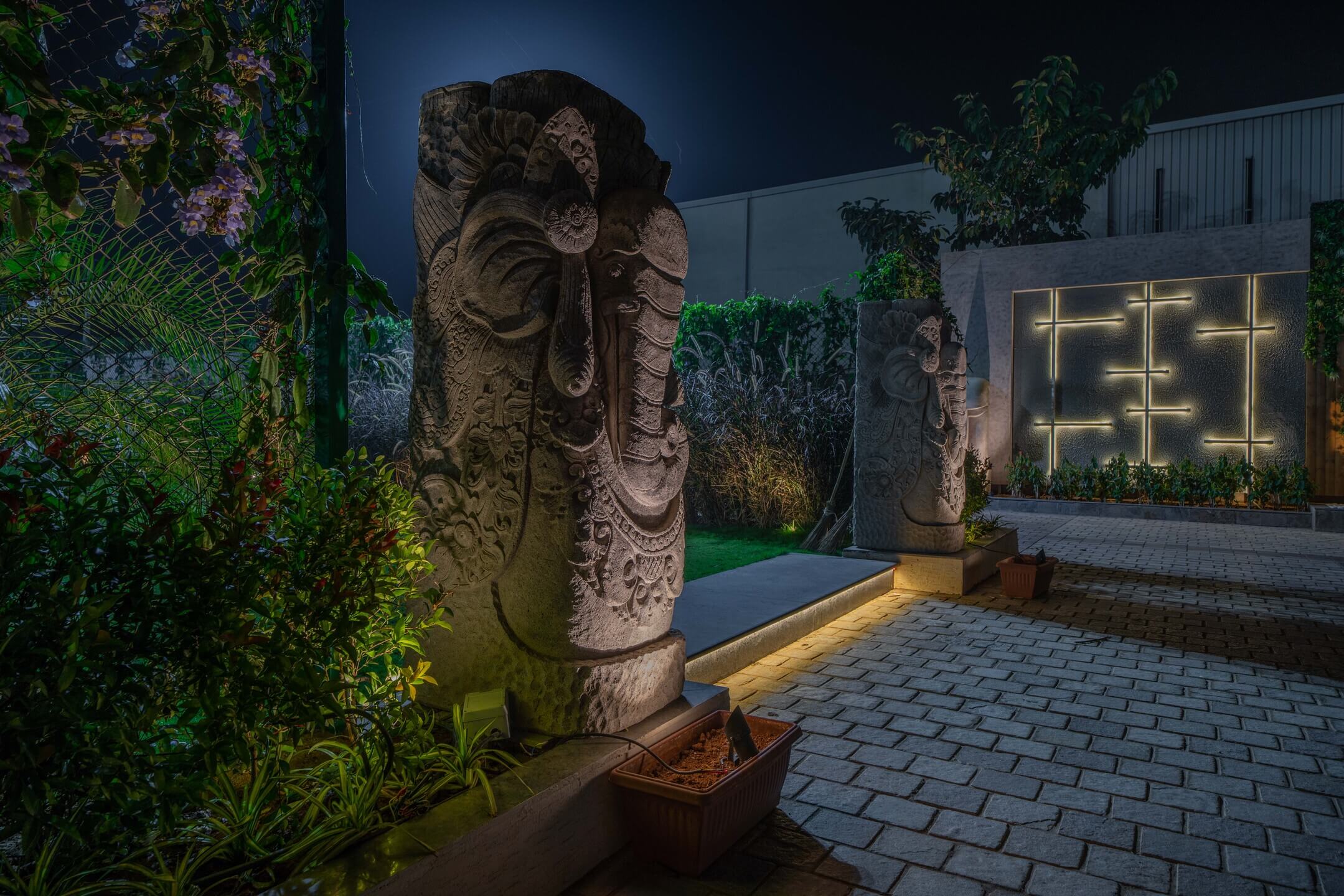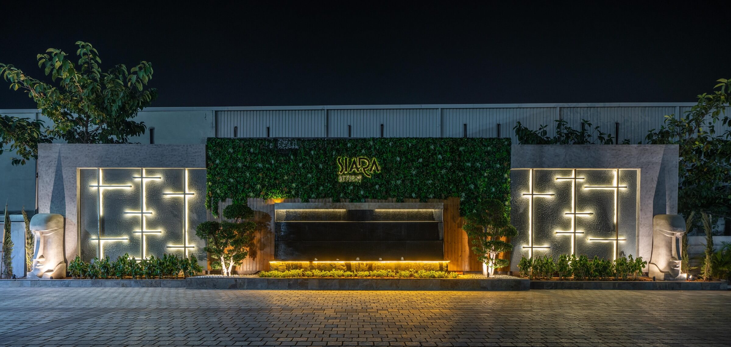 We added a feature wall at the drop-off plaza, marked by pronounced cobble paving along with a serene, ethereal cascading water body, complemented by a lush green wall around it that featured a back-lit metal frame to elevate the look of the signage wall.