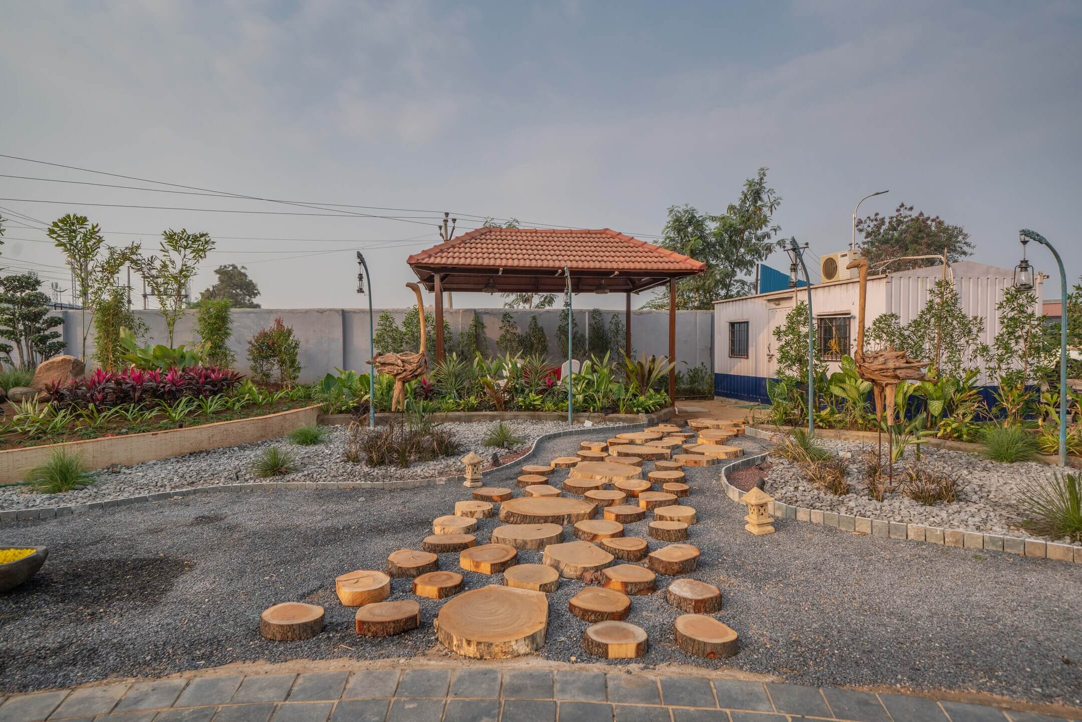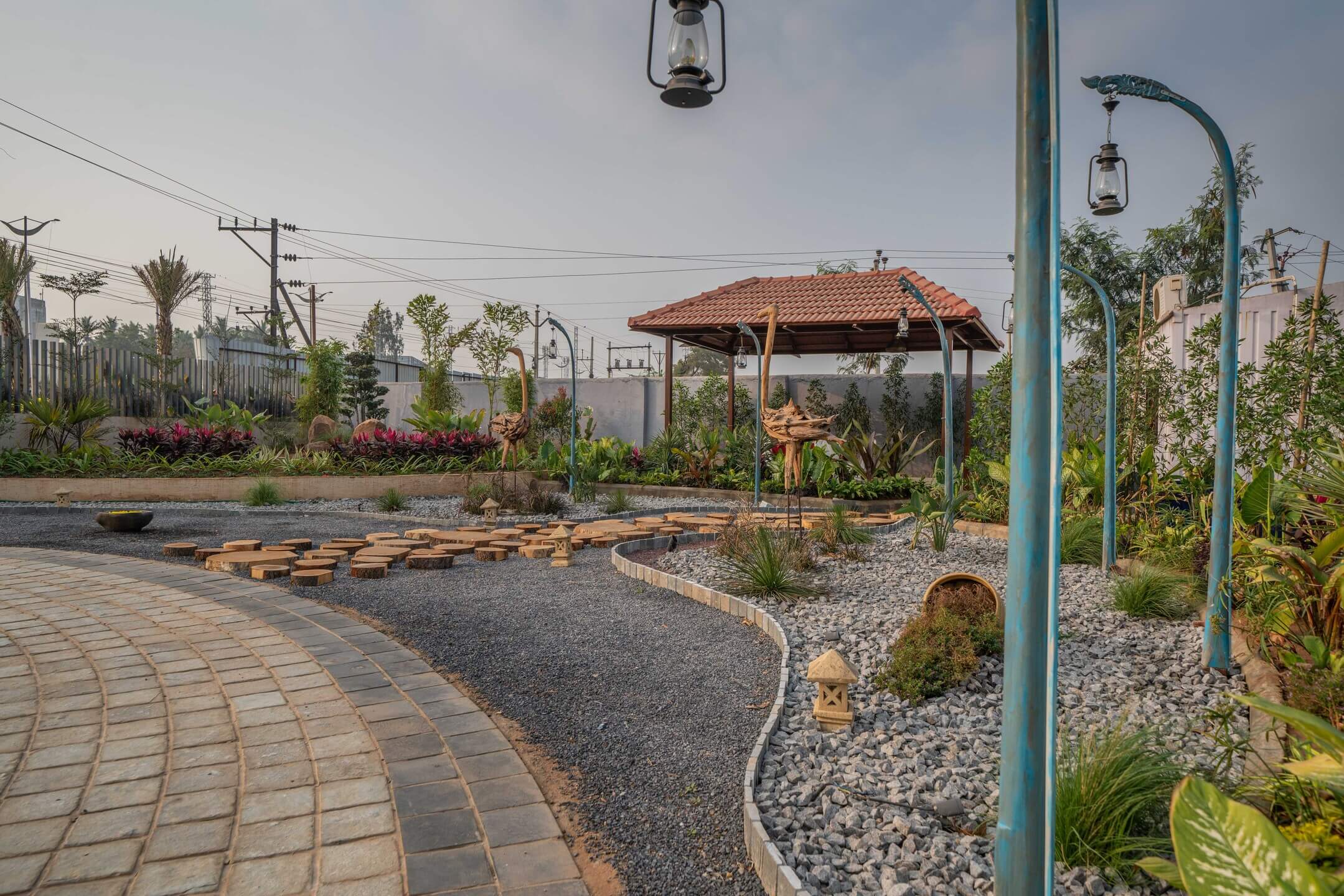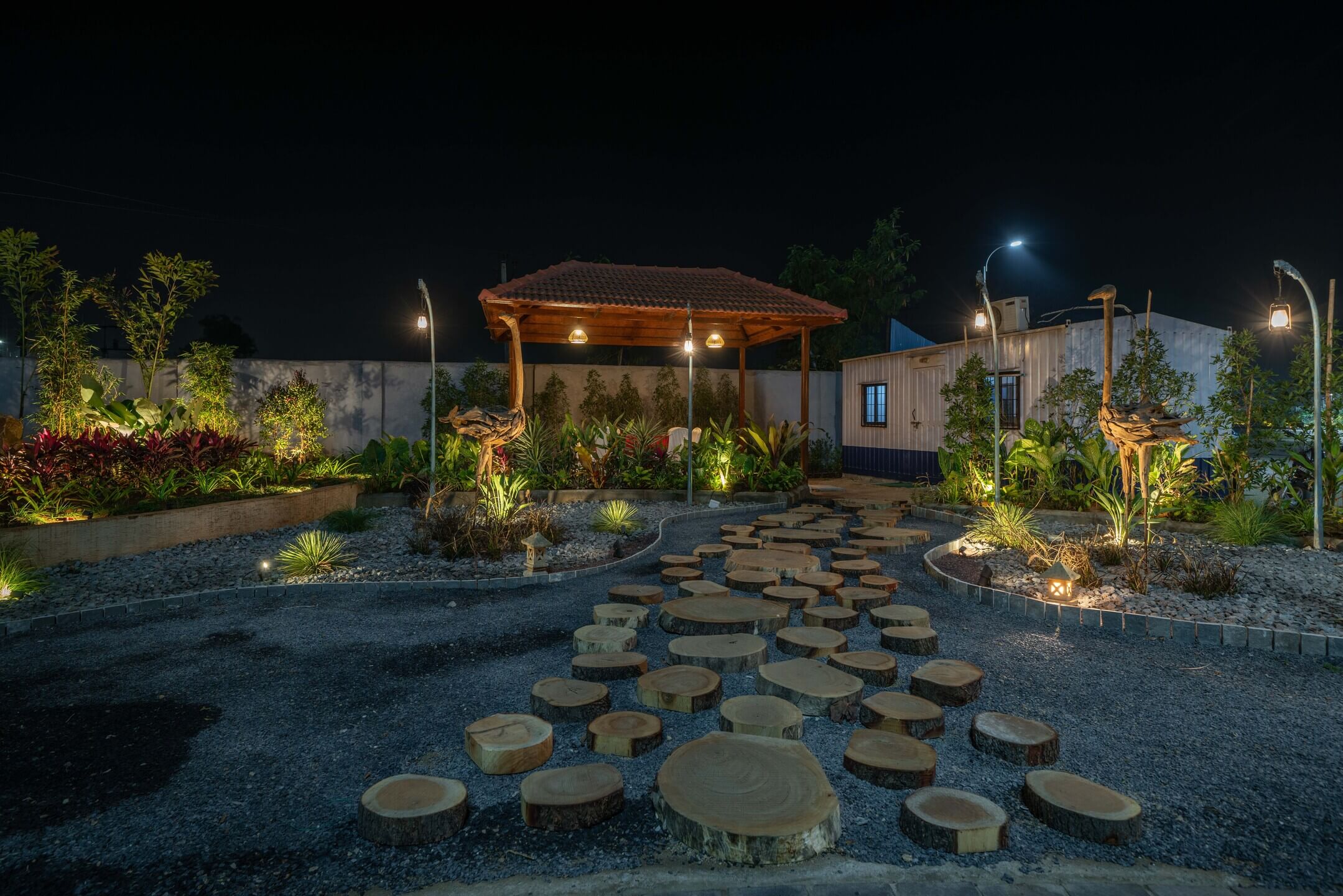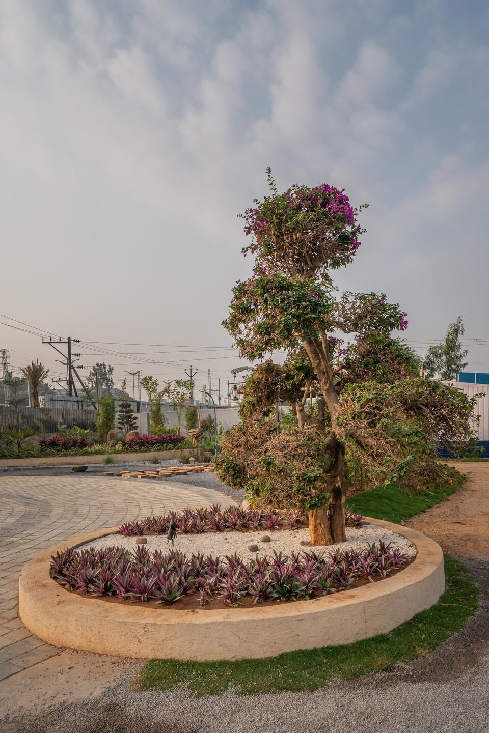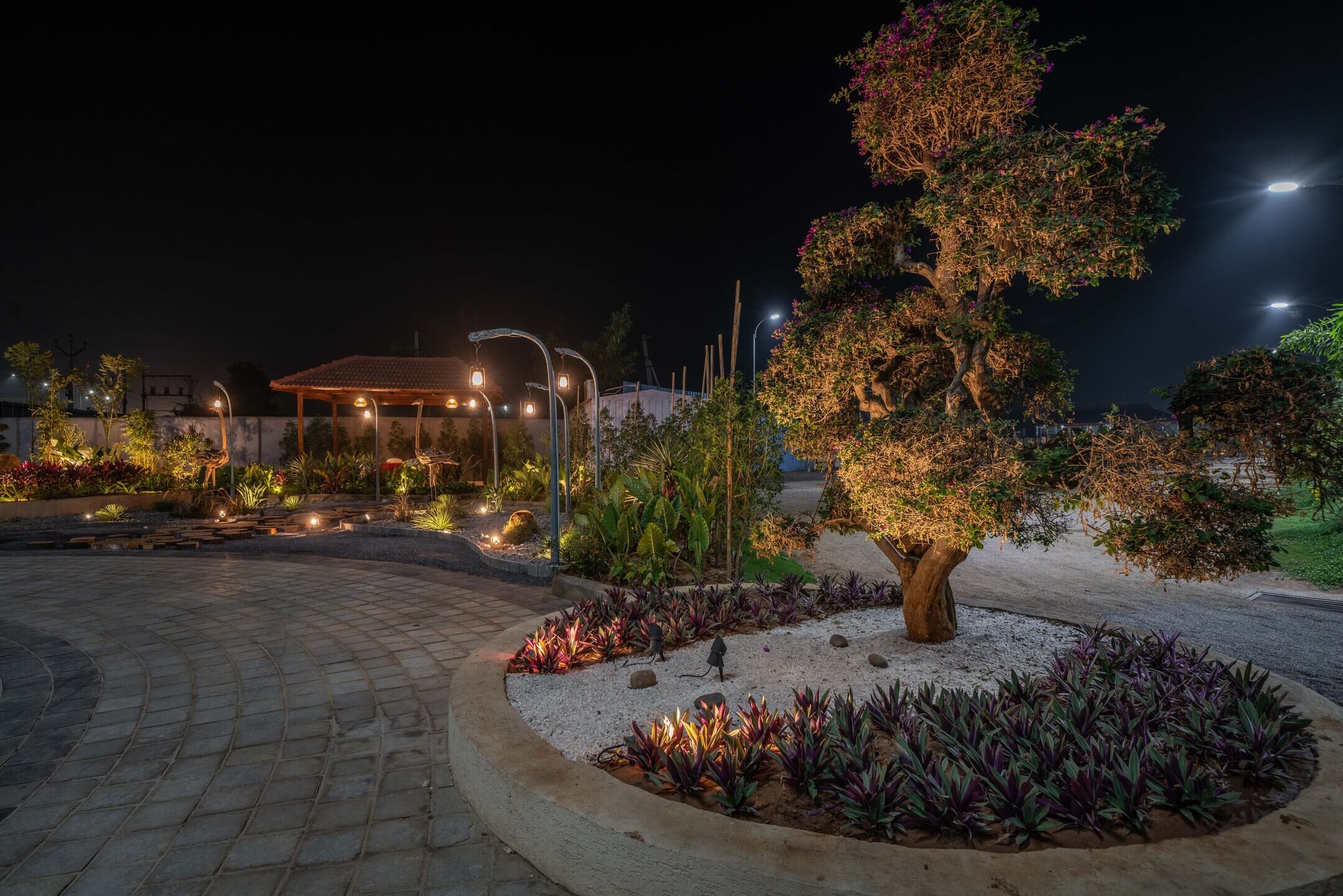 We added a feature wall at the drop-off plaza, marked by pronounced cobble paving along with a serene, ethereal cascading water body, complemented by a lush green wall around it that featured a back-lit metal frame to elevate the look of the signage wall.