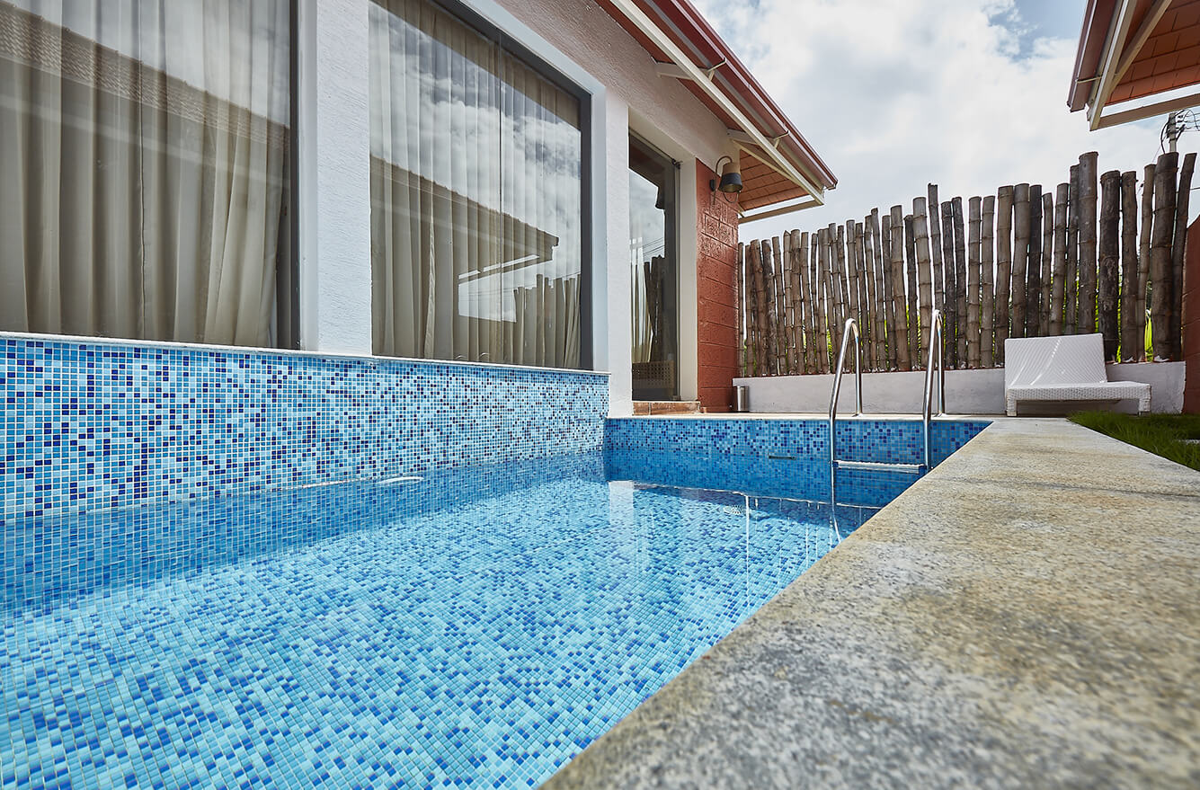 The rustic terracotta slate roof, an informal dining setting and lovely home-style wooden flooring gives the whole resort an earthly, warm natural feel. The private pools that come with each cottage are covered with bamboo for privacy. The cane furniture adds to the natural feel and doesnโt make the area look heavily designed, but adds to the closer-to-nature vibe. Truly, blissful to be living here midst the gorgeous Tea Plantations of Coorg.