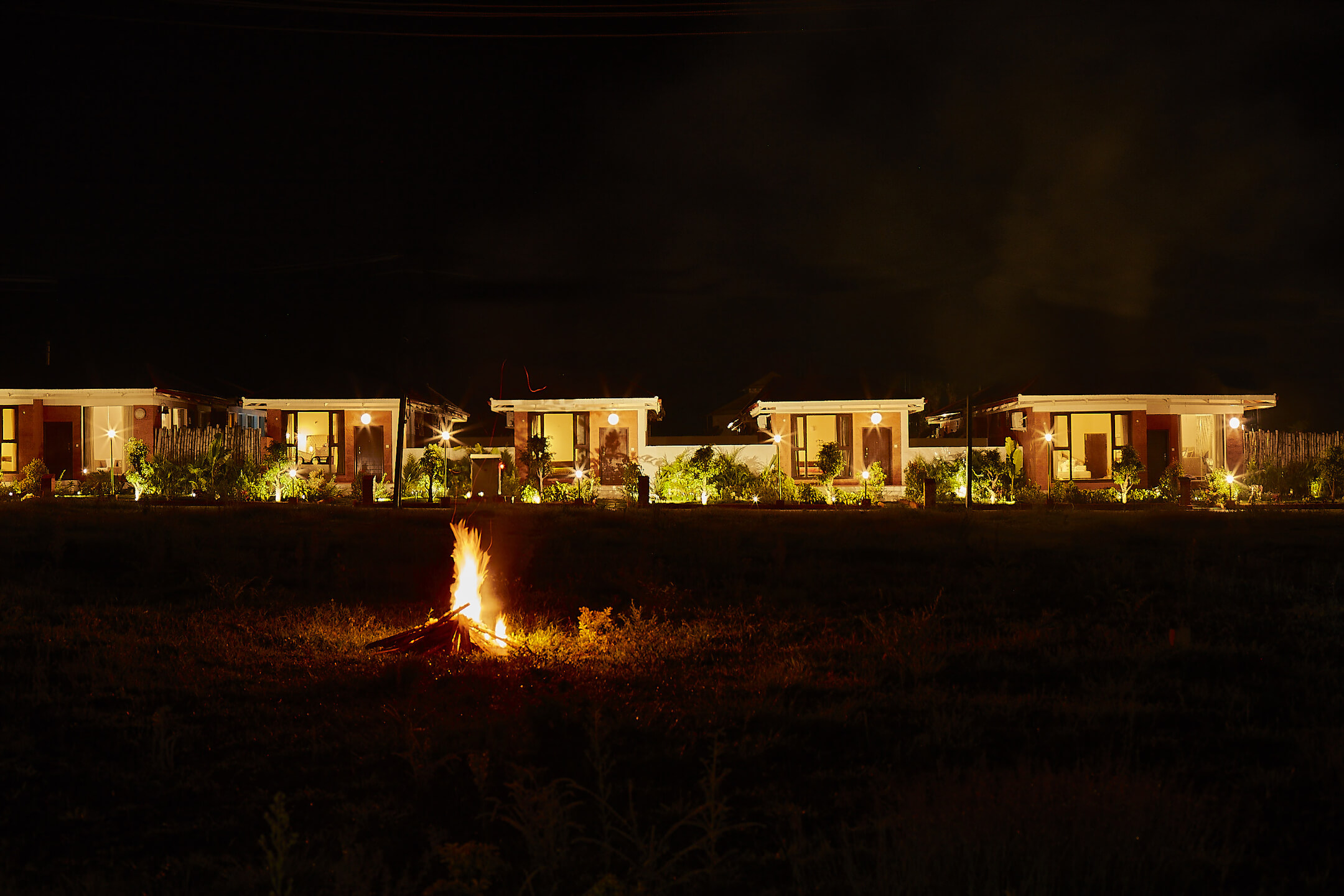 The cottages have been mindfully designed balancing out luxury and comfort to soothe all the travelers and vacationers who lay their heads to rest here. The dining area has been built on a raised platform with a fireplace right in front of it, creating a warm, cozy vibe right across from the cottages.